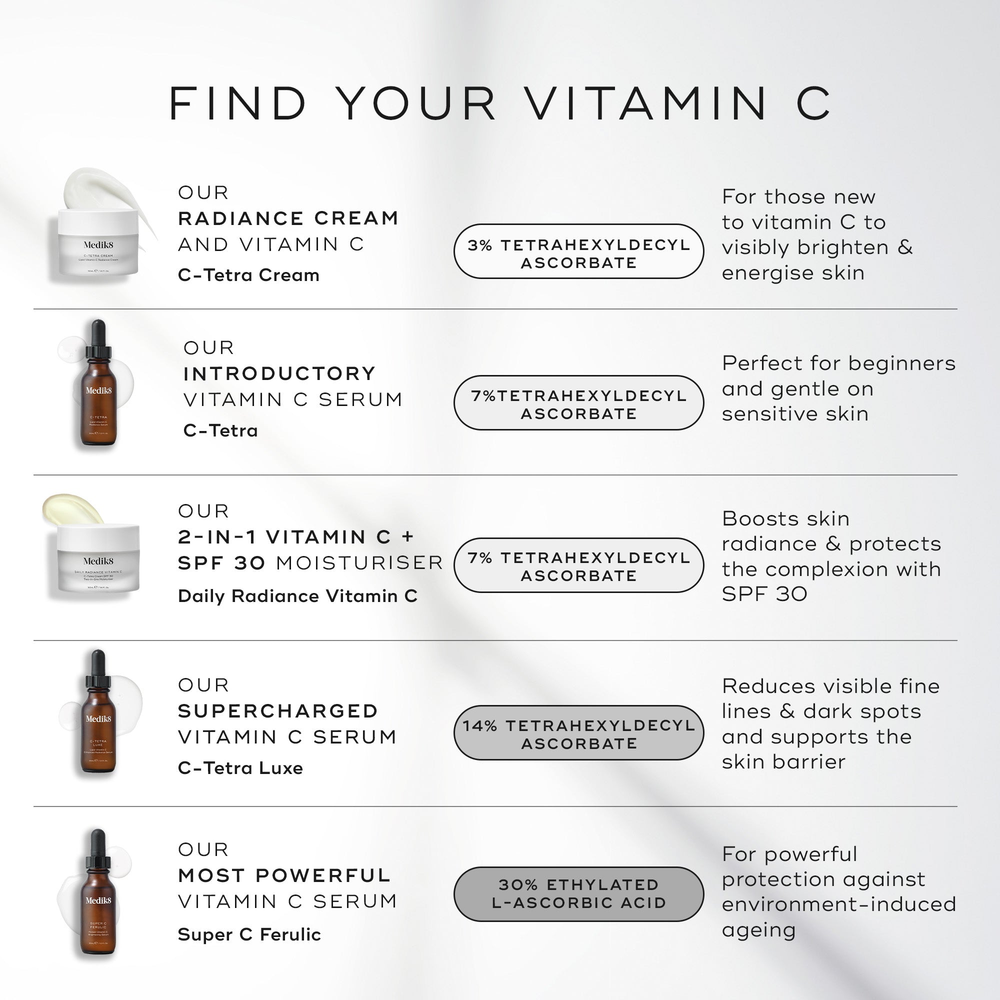 Hos Medik8 har vi en vitamin C-produkt som passar varje hudtyp och livsstil – från närande krämer och kraftfulla serum till SPF-hybrider.